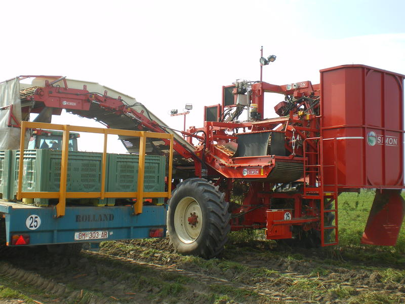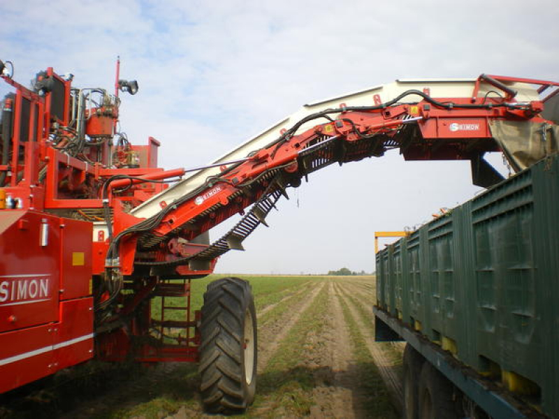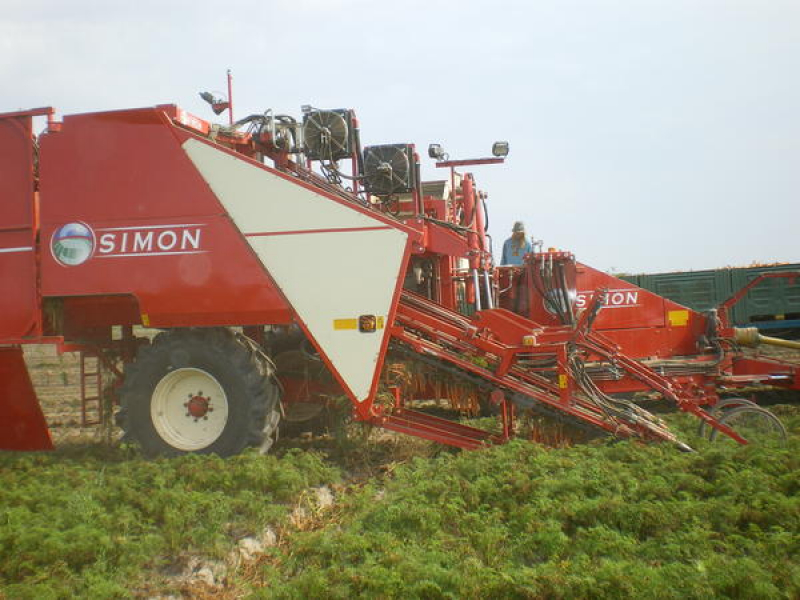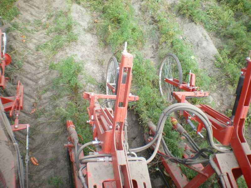Tractor-pulled carrot harvester with unloading into a trailer.