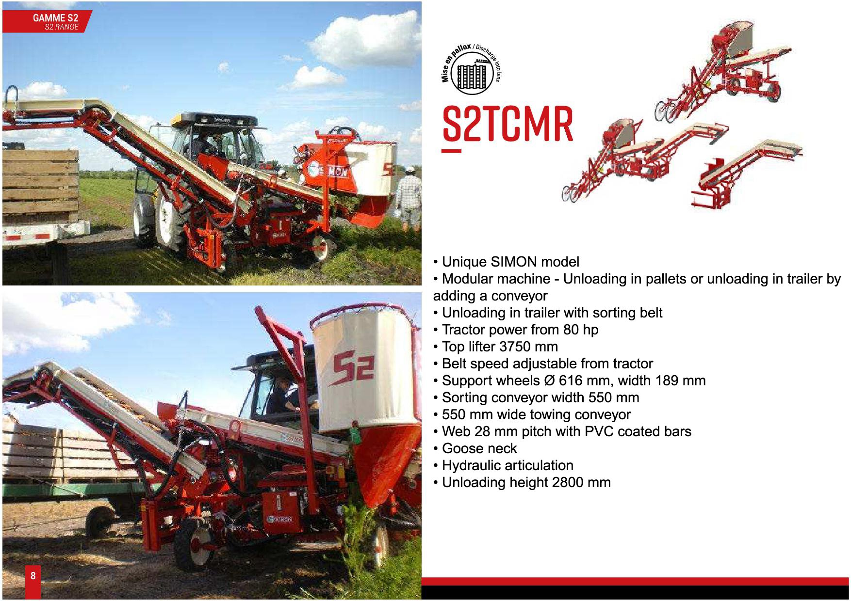 One of the most remarkable features of the SIMON S2TCMR is its modularity. This versatile harvester offers two discharge options: pallets or trailers, with the optional addition of a conveyor to make the process even more efficient. This means you can customize the machine according to the specific needs of your operation, providing unparalleled flexibility.