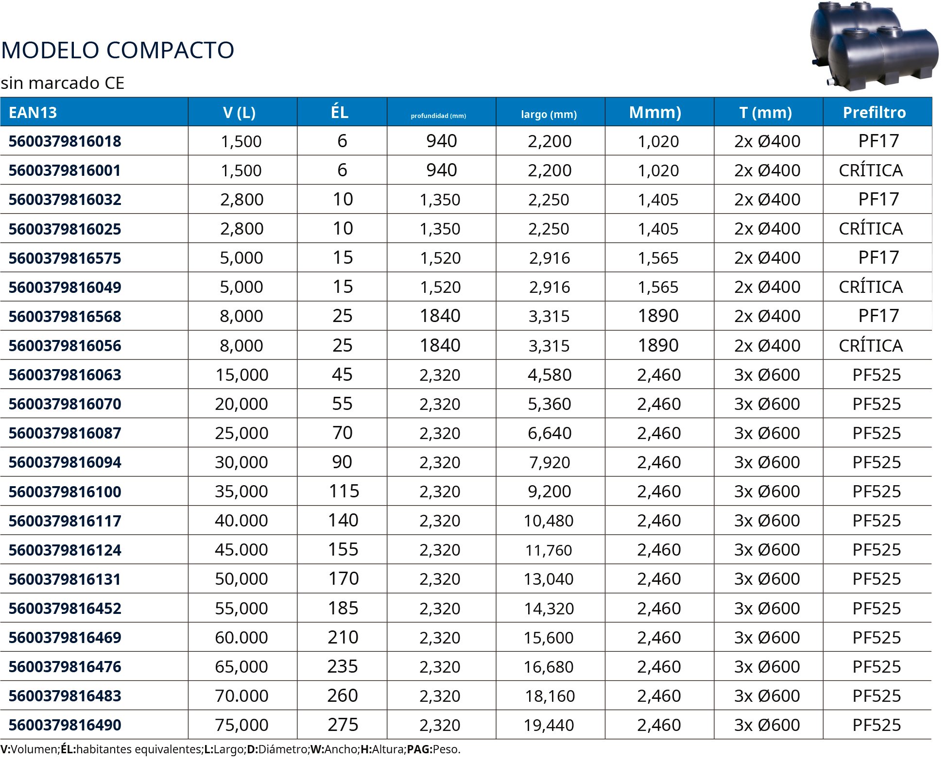 Las fosas sépticas compactas, también denominadas fosas sépticas biológicas, son equipos de tratamiento de aguas residuales domésticas, que mediante la combinación de un proceso de decantación, digestión anaerobia y tratamiento complementario aerobio, se consigue alcanzar una reducción significativa de la carga contaminante. La utilización del filtro biológico permite un elevado grado de tratamiento, sin recurrir al uso de cualquiertipo de equipo electromecánico. Fabricadas en polietileno de alta densidad, se vuelven resistentes a largo plazo y a las agresiones químicas. Poseen paredes interiores con superficie lisa, facilitando la limpieza e impidiendo la agregación y acumulación de residuos. El peso reducido de los equipos facilita el transporte y manejo.