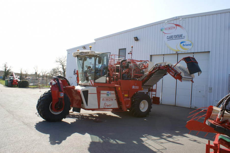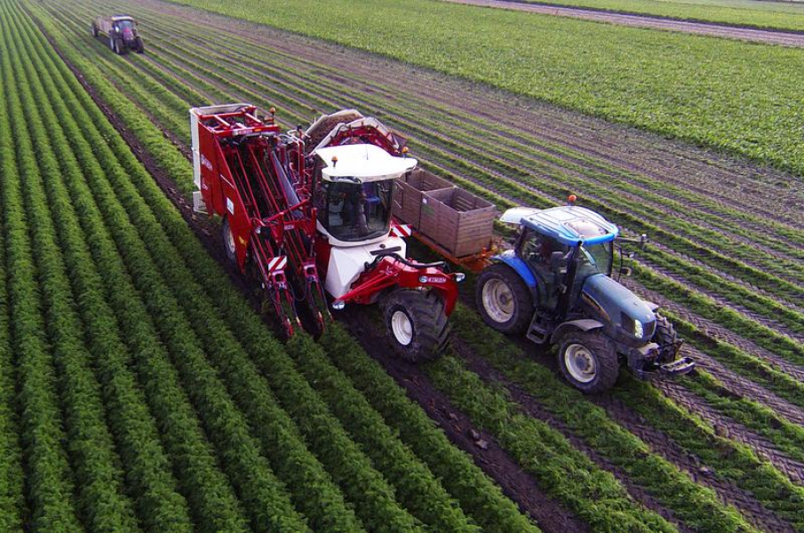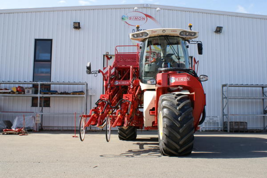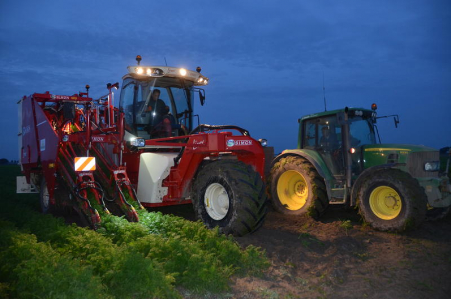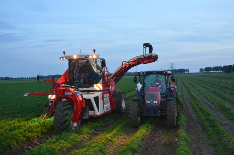 Récolteuse automotrice de carottes avec déchargement dans une remorque.