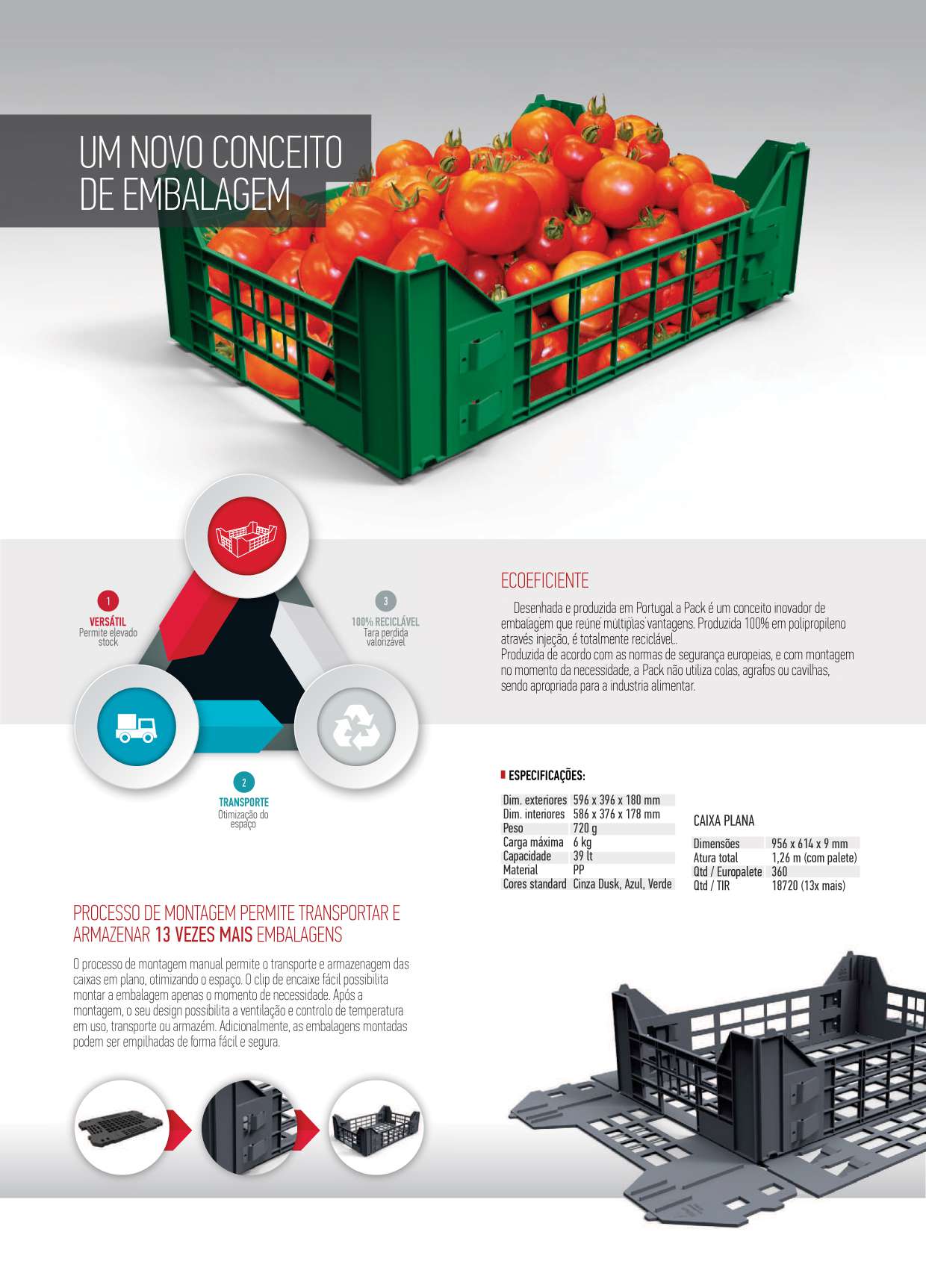 As caixa rebativeis são um conceito inovador de embalagem que reúne múltiplas vantagens. Produzida 100% em polipropileno através injeção, é totalmente reciclável. Desenhada e produzida em Portugal, a caixa rebativeis permitem uma otimização de espaço através do transporte e armazenagem, de aproximadamente mais 13 vezes o número de embalagens convencionais, reduzindo os custos e a pegada ambiental. Produzida de acordo com as normas de segurança europeias, e com montagem no momento de necessidade, as caixa rebativeis não utilizam colas, agrafos ou cavilhas, sendo apropriada para a industria alimentar.Ecoeficiente