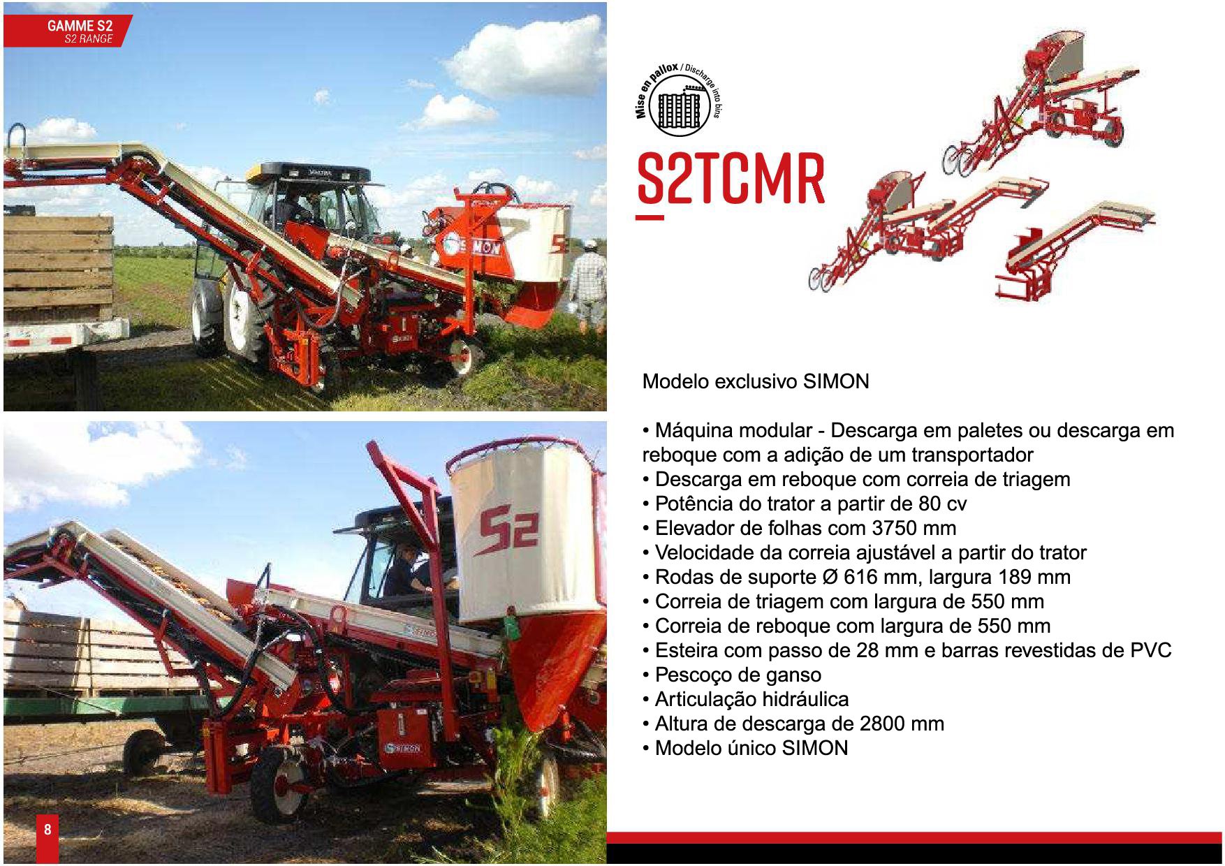 Uma das características mais marcantes do SIMON S2TCMR é sua modularidade. Essa colhedora versátil oferece duas opções de descarga: paletes ou reboque, com a adição opcional de um transportador para tornar o processo ainda mais eficiente. Isso significa que você pode personalizar a máquina de acordo com as necessidades específicas da sua operação, proporcionando flexibilidade incomparável.