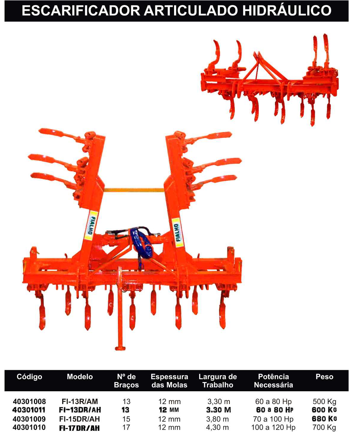 Descrição: Explore uma nova dimensão em escarificação com os Escarificadores Reforçados Articulados Hidráulicos FIALHO da Série FI-DR-AH. Estes escarificadores montados apresentam braços articulados equipados com molas helicoidais duplas de 12 mm, proporcionando um desempenho excepcional em seu terreno.