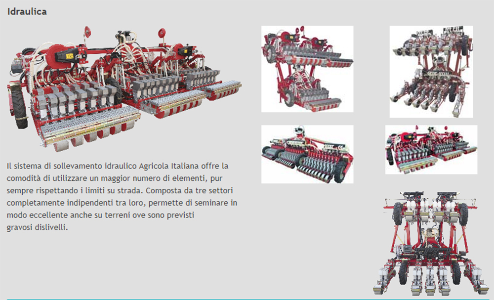 O sistema de elevação hidráulico agrícola italiano oferece a conveniência de usar um maior número de elementos, respeitando sempre os limites da estrada. composto por três setores completamente independentes, permite uma excelente semeadura, mesmo em solos onde esperam fortes gradientes.