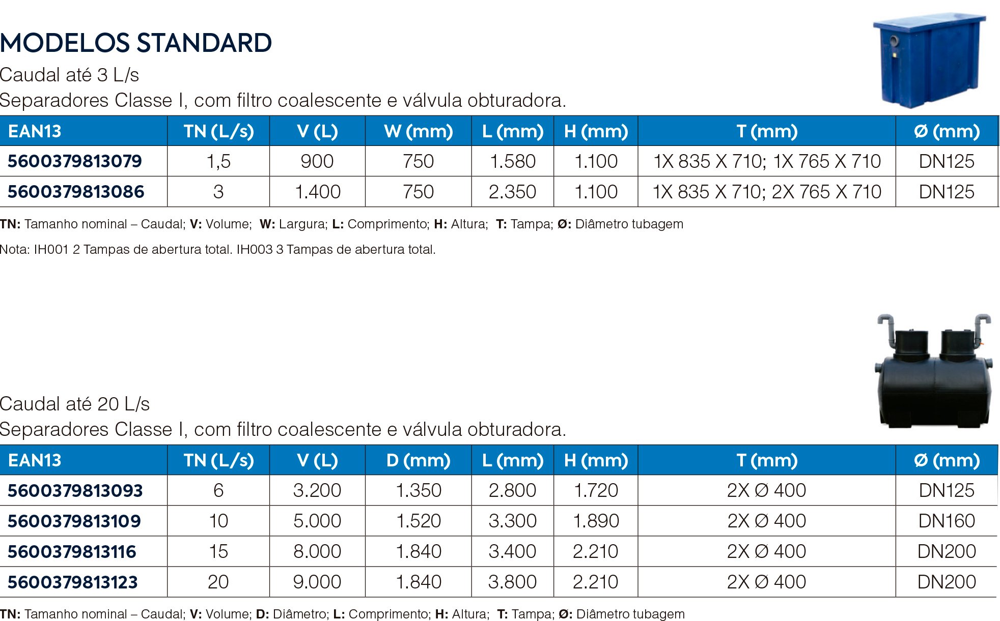 O Separador de Hidrocarbonetos Classe I, pré-fabricado em Polietileno de Alta Densidade foi concebido de acordo com a Norma Europeia EN-858, para receber a totalidade das águas oleosas. O separador de hidrocarbonetos admite à entrada águas oleosas não emulsionadas quimicamente, contendo hidrocarbonetos com densidades compreendidas entre 0,85 e 0,95. As matérias mais pesadas (lamas, areias, etc) vão sedimentar no decantador ficando aí retidas. Este Compartimento vai também ser responsável por reter hidrocarbonetos que se encontram em formas facilmente flotáveis. Para a zona de coalescência passam apenas os hidrocarbonetos que sencontram em partículas menores.
