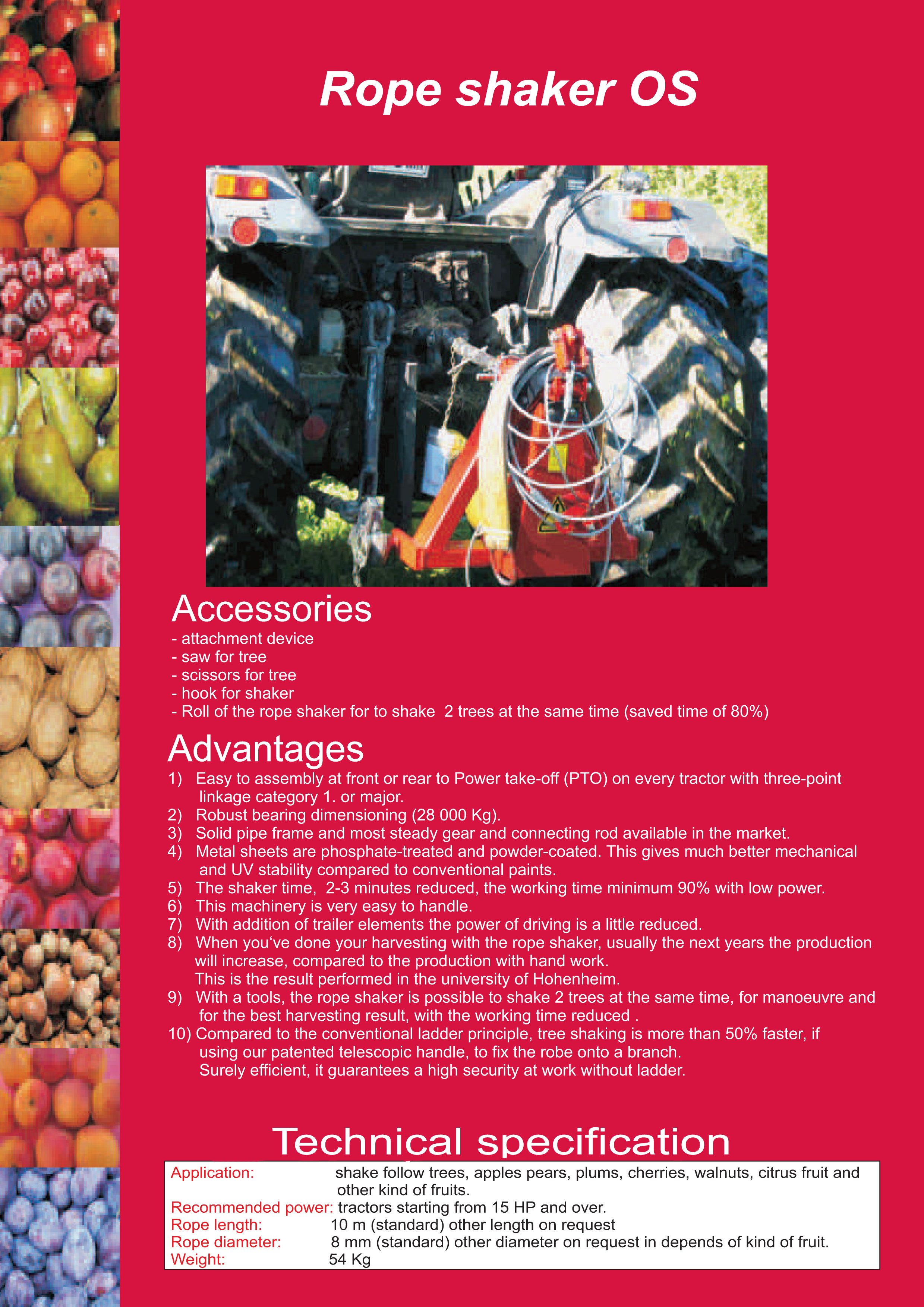 The OS fruit shaker is a 3-point rope stirrer. It is well connected to the tractor at the front or rear and powered by the PTO. The 54-pound unit is usually equipped with a ten-foot-long steel cable that is attached to the main branches of the crown. Then the rope is tight and ready for the stirring process to begin.