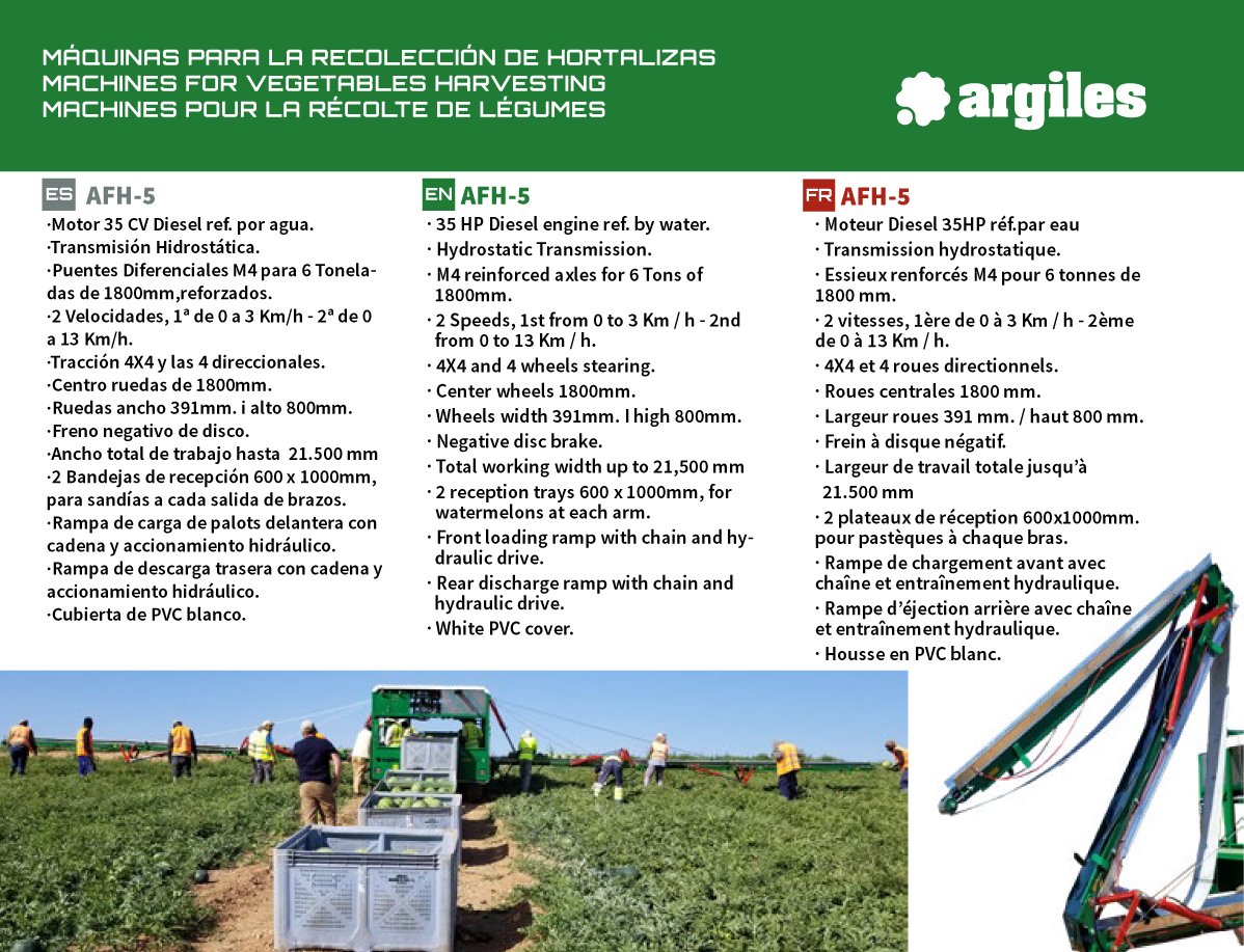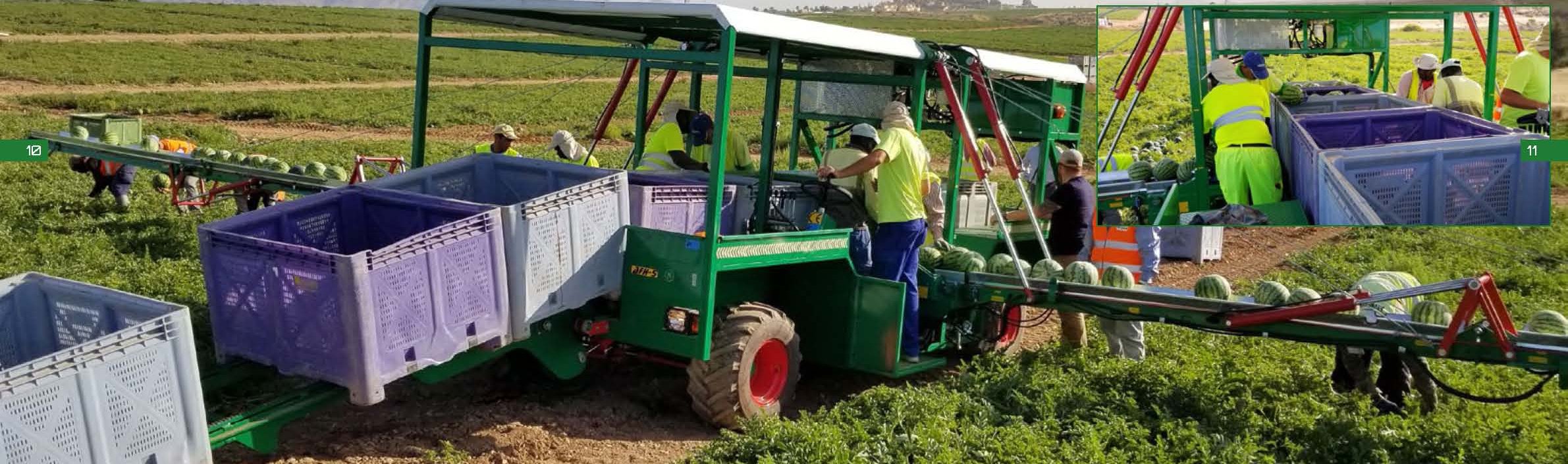. 2 bandejas de recepción de 600 x 1000 mm, para sandías y melones en cada salida de los brazos.