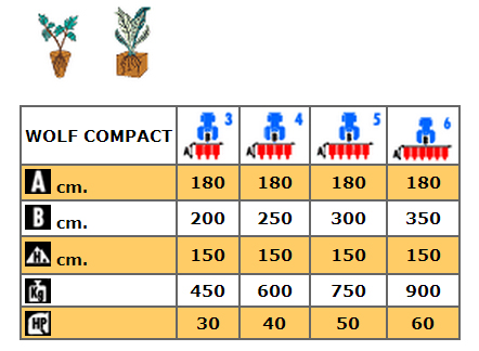 Wolf Compact diffère principalement Wolf, la distance entre les lignes peut être réduite à un minimum de 30 cm; la configuration de la machine présente une section orifice arrière du plateau, deux étagères, châssis arrière avec des roues de support.