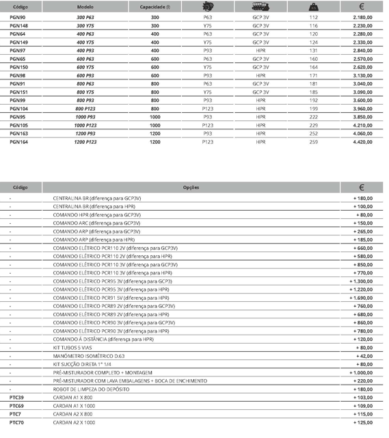 Depósito principal: em polietileno com capacidades de 300 a 1200 litros.
