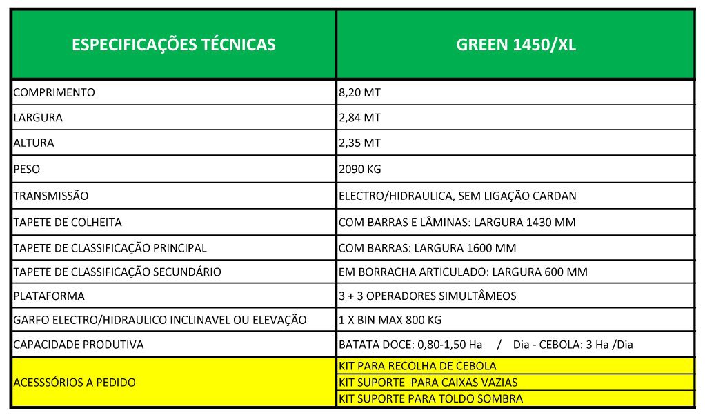 Seu design simples e moderno não apenas contribui para sua aparência estética, mas também facilita a operação e manutenção. A combinação de desempenho de qualidade, capacidade de processamento eficiente e características inovadoras torna a GREEN 1450/XL uma opção única no setor de colheita de batatas e cultivos relacionados.