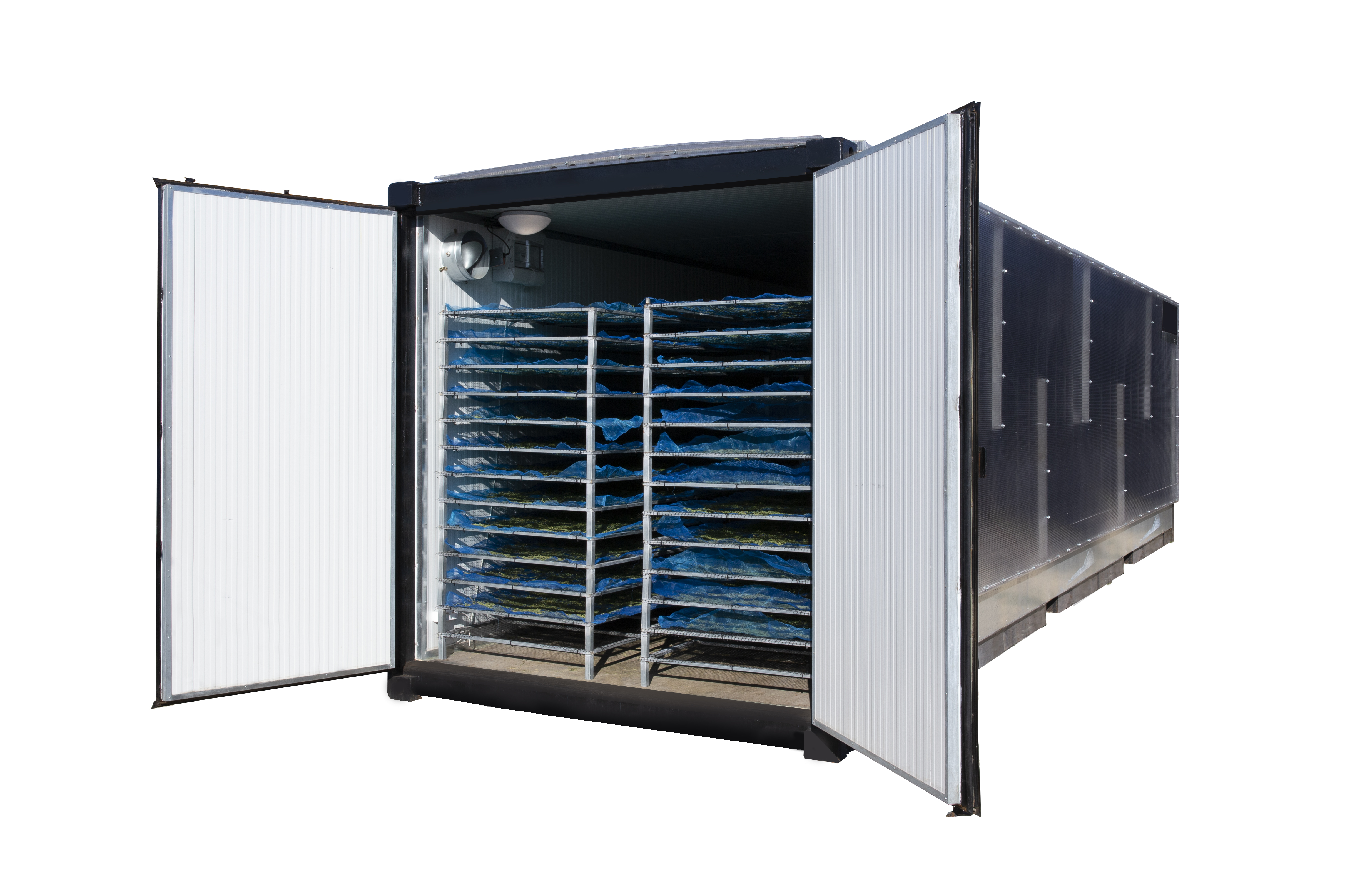 Boxes ventiladas - Caixas com rodas permitindo uma fácil deslocação. São ventiladas no sentido ascendente, proporcionam uma secagem mais rápida e reduzem substancialmente a mão-de-obra. Podem ser carregadas e descarregadas mecanicamente no exterior do secador.